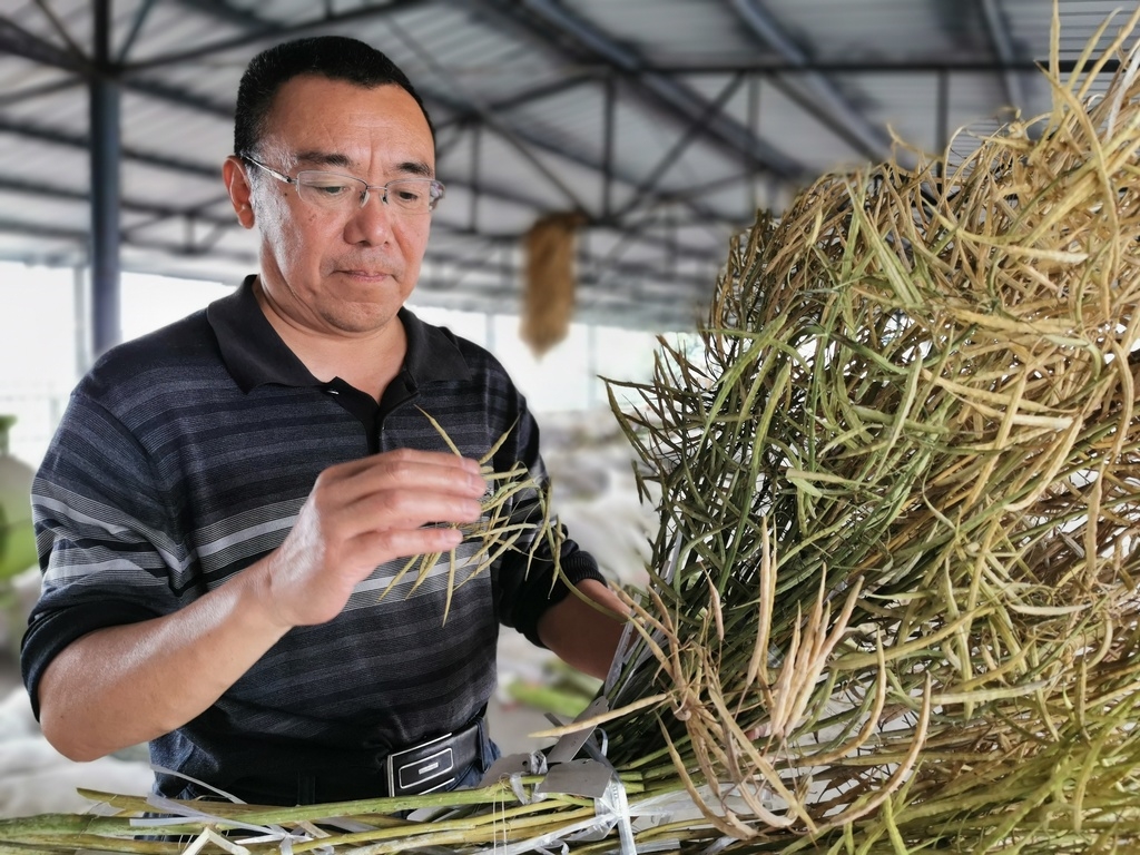 四川科乐油菜研究开发有限公司负责人、首席育种专家左上歧查看采收回来的油菜籽(张伟 摄)
