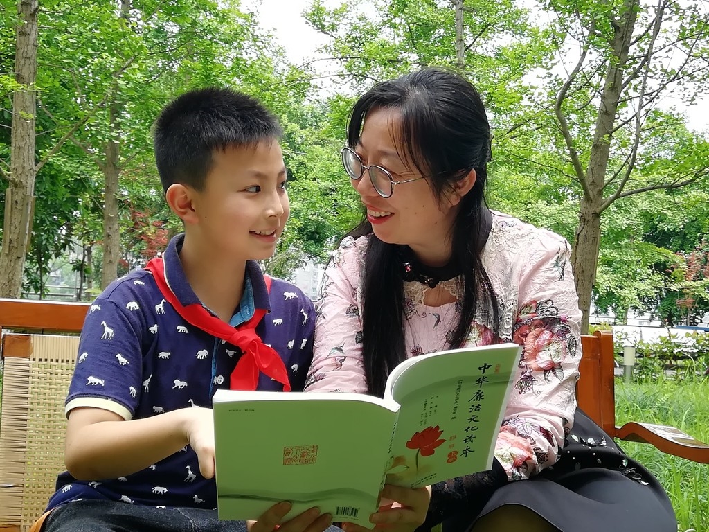 区教育和体育局团工委书记苏勤陪儿子阅读《中华廉洁文化读本》,感受廉洁文化