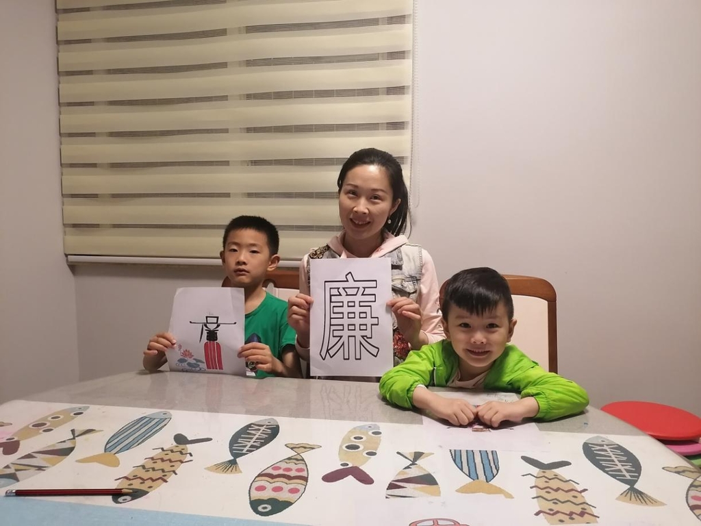 区检察院干警王丽正在教孩子识“廉”书“廉”,让“廉”根植孩子心中