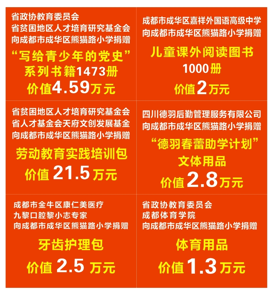 “希望你们牢记习近平总书记的嘱托,坚守初心使命,爱孩子、爱学生,用真情、真心、真诚滋润孩子的心田,让每一个学生都享受成长的快乐。”捐赠仪式上,四川省政协副主席赵振铣寄语学校教师。他呼吁社会各界人士大力支持少儿工作,关心少年儿童健康成长。