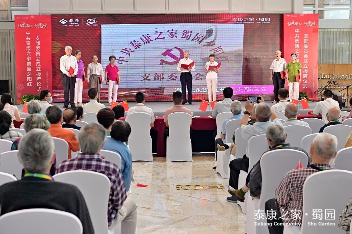 5月31日,中共泰康之家蜀园夕阳红支部委员会成立授牌仪式在成都温江的泰康之家•蜀园举行,这是继燕园、粤园、吴园、楚园之后,泰康之家第五个成立社区居民基层党组织的养老社区。