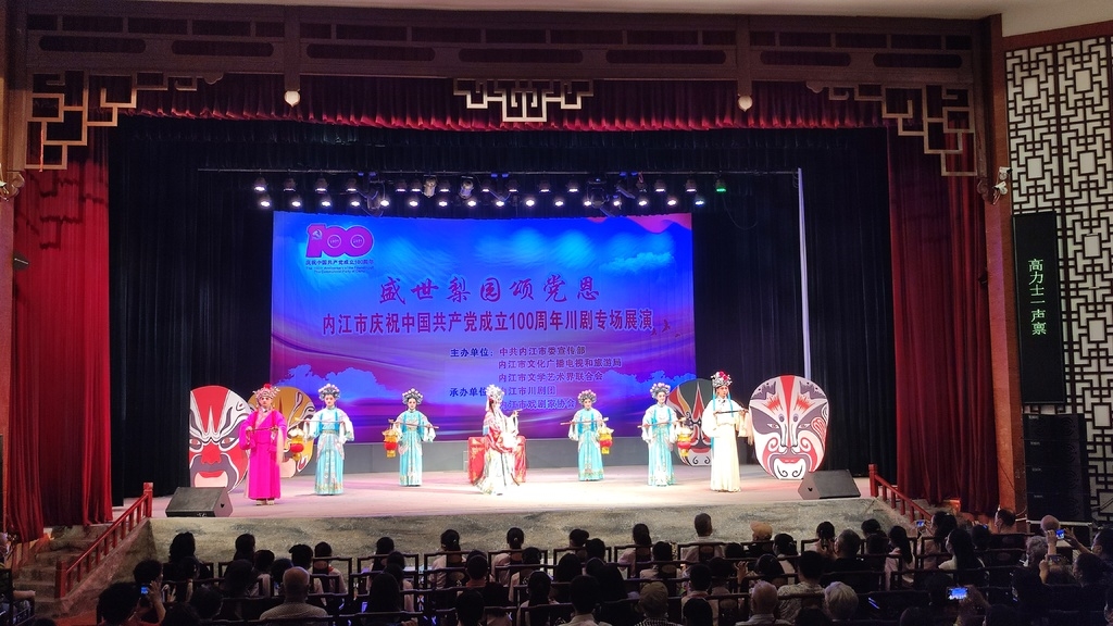 6月1日下午,内江市庆祝中国共产党成立100周年川剧专场展演,在内江市川剧团剧场举行。折子戏《思凡》、《人间好》、《归舟》,川剧《下太行》《军民鱼水情》《我们是工农子弟兵》等16个节目精彩上演,引得现场阵阵喝彩。