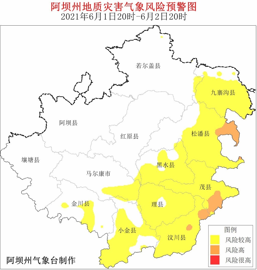 根据气象资料分析,6月1日20时-6月2日20时,汶川县、理县、茂县、松潘县、九寨沟县、金川县、小金县、黑水县、若尔盖县、红原县、马尔康市等11县(市)发生地质灾害气象风险等级较高,其中汶川县、茂县、松潘县的部分地方发生地质灾害气象风险等级高,请注意预防。