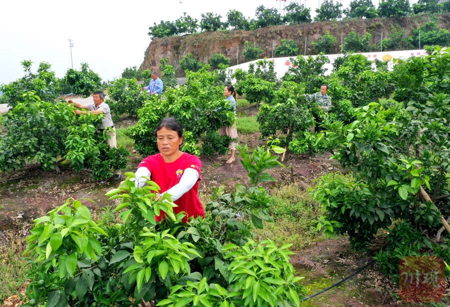 6月2日,仁寿县藕塘镇齐心村党建柑橘产业园内村民正在果园里劳作。
