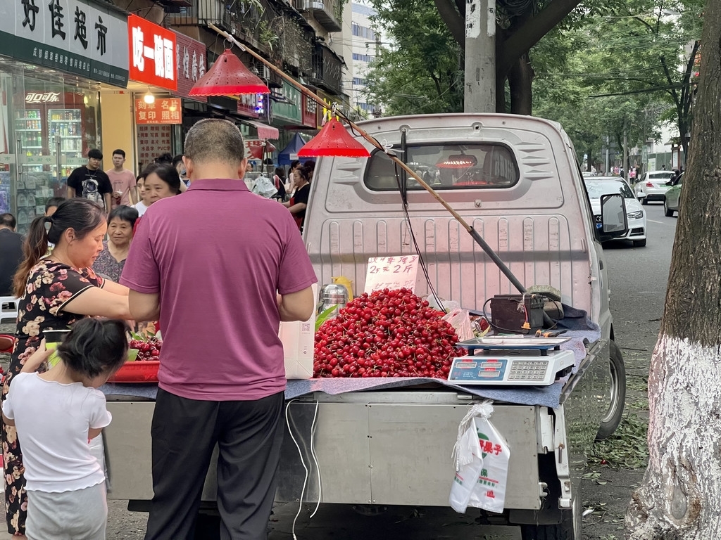 “卖樱桃,汶川樱桃,垮价了,垮价了,10元一斤。”6月1日晚,成都市成华区昭觉寺南路人来人往,不少市民水果店的叫卖声吸引,停下来挑选。不一会儿,樱桃筐几乎减见。