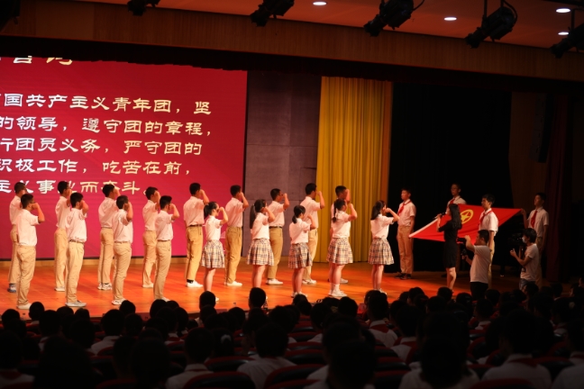 活动在庄严的国歌声和《致敬红领巾》主题微视频中拉开序幕,西川实验学校八年级490余学生参与了离队入团仪式。学校党员教师代表为新团员颁发团章、团员证并佩戴团徽,带领全体团员庄严宣誓,团员代表号召大家牢记入团誓词,开拓眼界,增长才干,做合格的社会主义建设者和接班人,党员家长代表通过视频为孩子们献上成长寄语,鼓励全体同学带着少先队员的荣耀砥砺奋发,不负韶华。“希望同学们与我一起,牢记入团誓词,开拓眼界,增长才干,做合格的社会主义建设者和接班人。”八年级学生岳仲涵作为新团员代表发言。(图片来源:武侯区教育局)