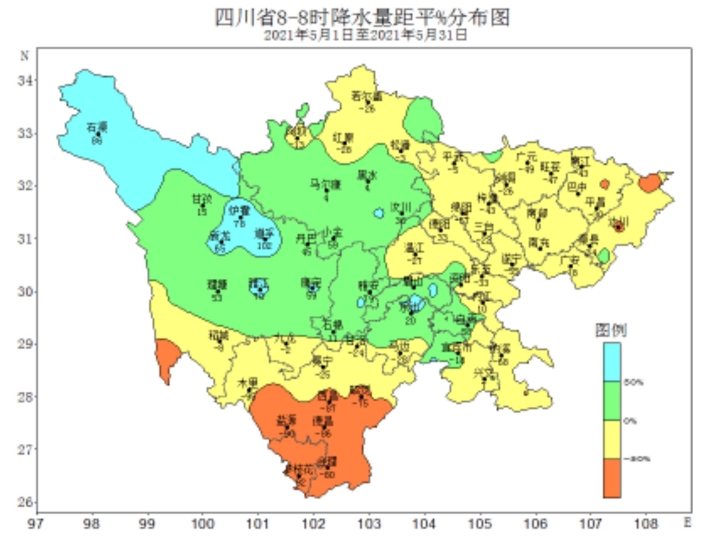 四川省气候中心实况监测显示,2021年5月全省平均气温19.8℃,较常年同期偏高0.2℃;全省平均降水量85.9毫米,较常年同期偏少12%。截至5月31日,攀西地区大部为中旱,其中西昌、盐源、德昌、会理等站点达到重度以上旱情。