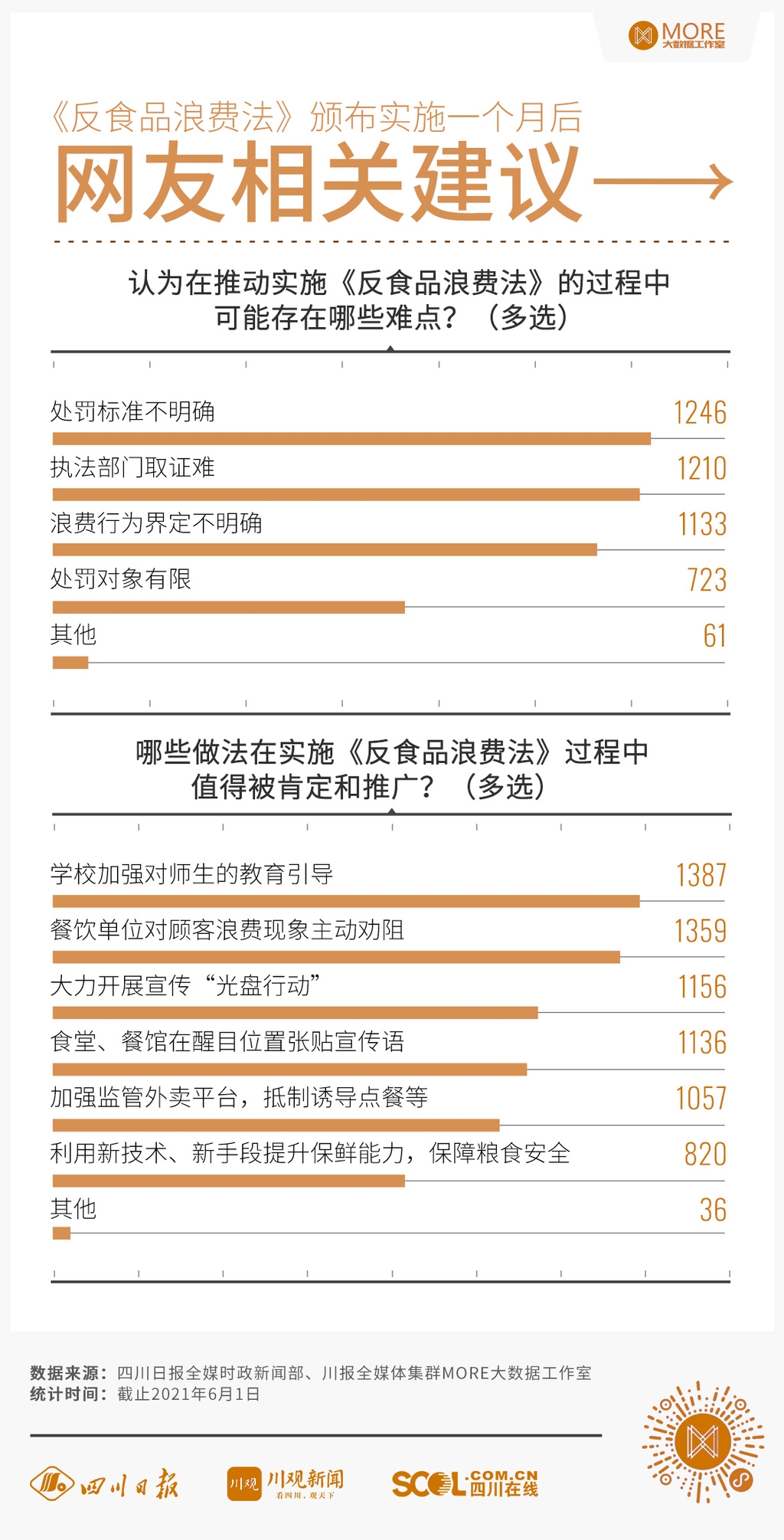 学校加强对师生的教育引导、餐饮单位对顾客浪费现象主动劝阻、大力开展宣传“光盘行动”、利用新技术新手段提升保险能力……调查中,网友们对各行各业在实施《反食品浪费法》过程中采取的方式给予了肯定。