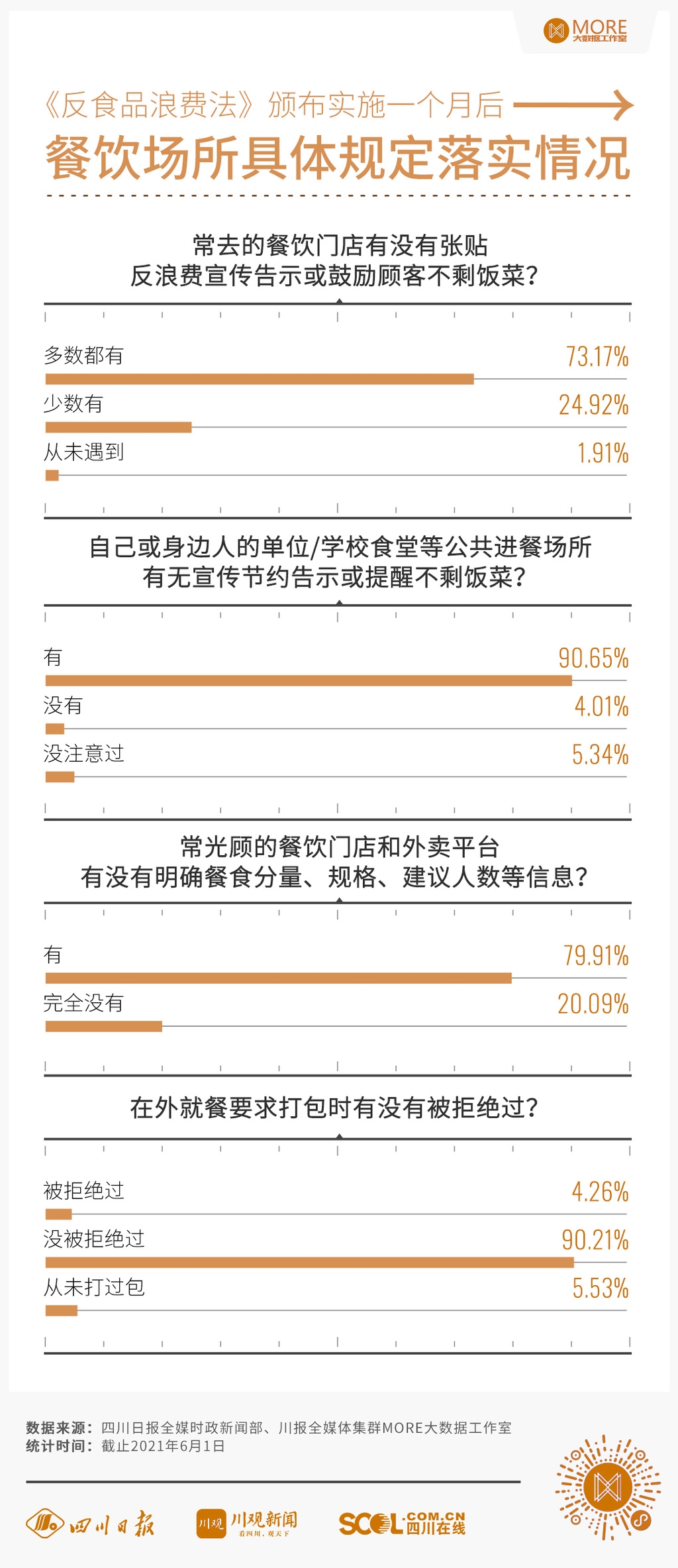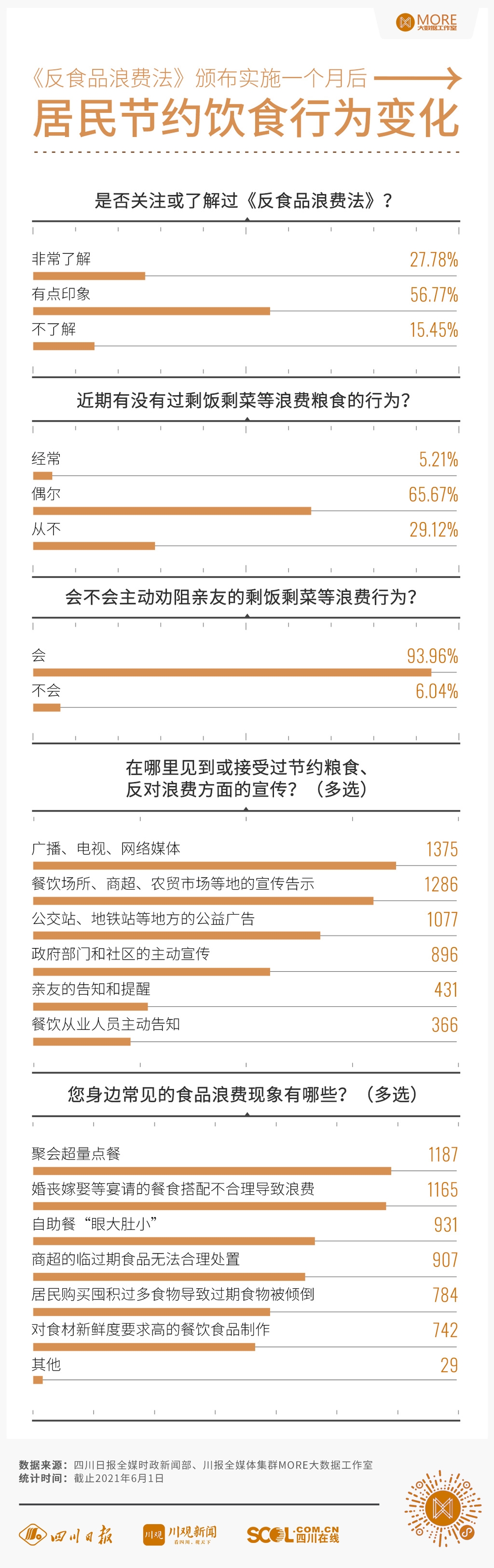 今年4月29日,《中华人民共和国反食品浪费法》(以下简称《反食品浪费法》)正式颁布实施。如今,这部致力于弘扬勤俭节约传统美德,惩治食品浪费行为的法律已实施一个月。它给我们的生活带来了哪些变化?各类餐饮服务单位对新法的了解程度和响应程度如何?对于“浪费粮食要被罚”等法律新规,各方又有什么话想说?川报全媒体开展了反食品浪费现状感知度问卷调查和现场走访。结果如何,一起来看看。