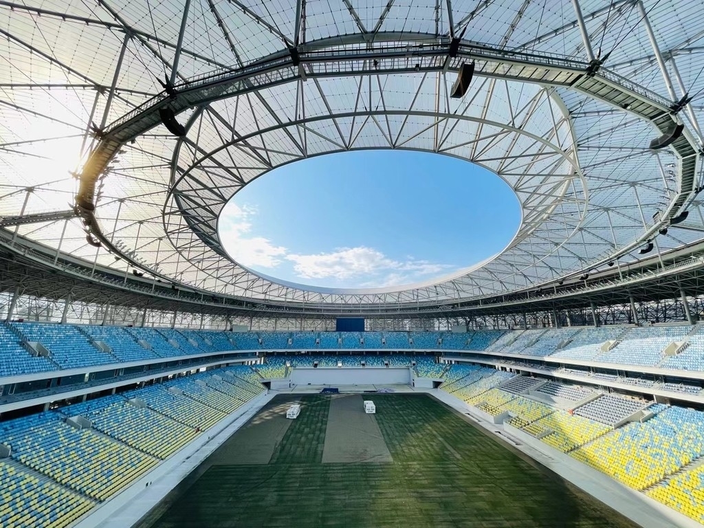 成都凤凰山体育公园,成功应用了《大开口索穹顶施工关键技术》。该体育公园足球场屋盖根据建筑覆盖材料的不同选择了与之相适应的结构体系,索穹顶结构最大悬挑跨度约63米,南北跨度约279米,东西跨度234米,外周设受压网架及环柱,内环桁架南端低北端高,最高点标高为64米,是全国首例大开口整体张拉索穹顶结构。
