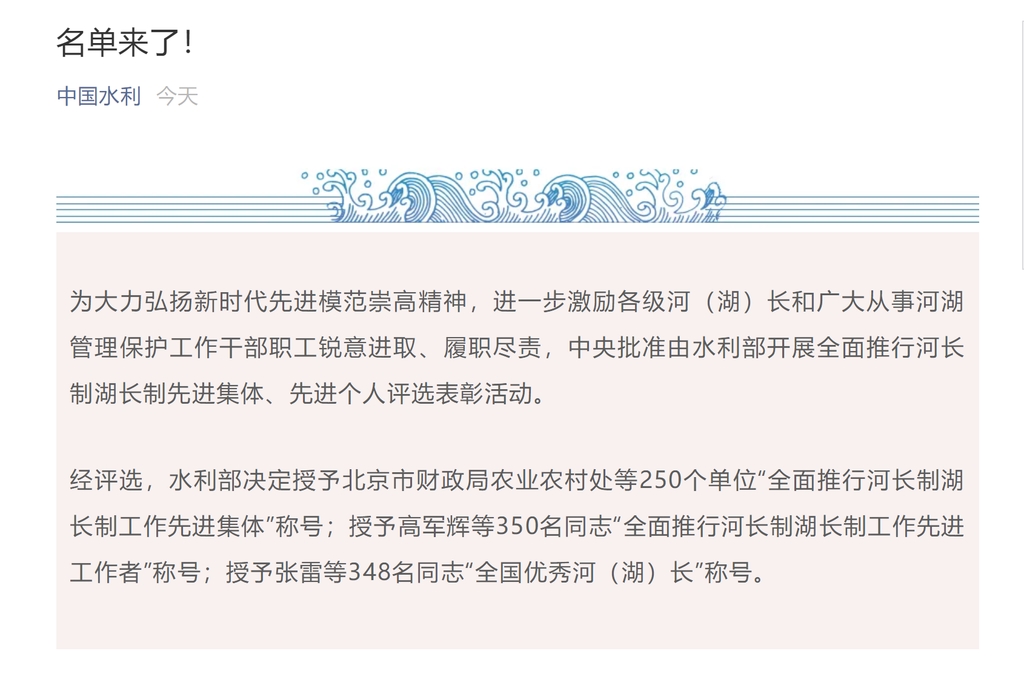 6月4日,记者从水利部官方微信公众号“中国水利”获悉,经前期评选,水利部决定授予北京市财政局农业农村处等250个单位“全面推行河长制湖长制工作先进集体”称号;授予高军辉等350名同志“全面推行河长制湖长制工作先进工作者”称号;授予张雷等348名同志“全国优秀河(湖)长”称号。