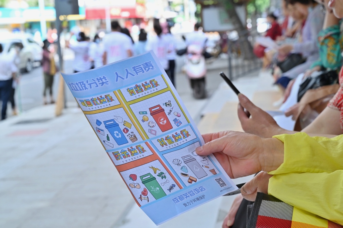 成都芙蓉饭店组织30多名员工在过街楼街、红墙巷,向沿街商铺和居民发送保护环境宣传单,他们走进社区,在居民楼帮助清洁楼道、捡拾绿化带里随意丢弃的垃圾、清扫院子、清理墙上乱张贴的小广告等。