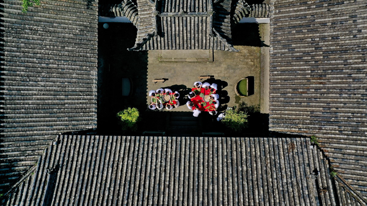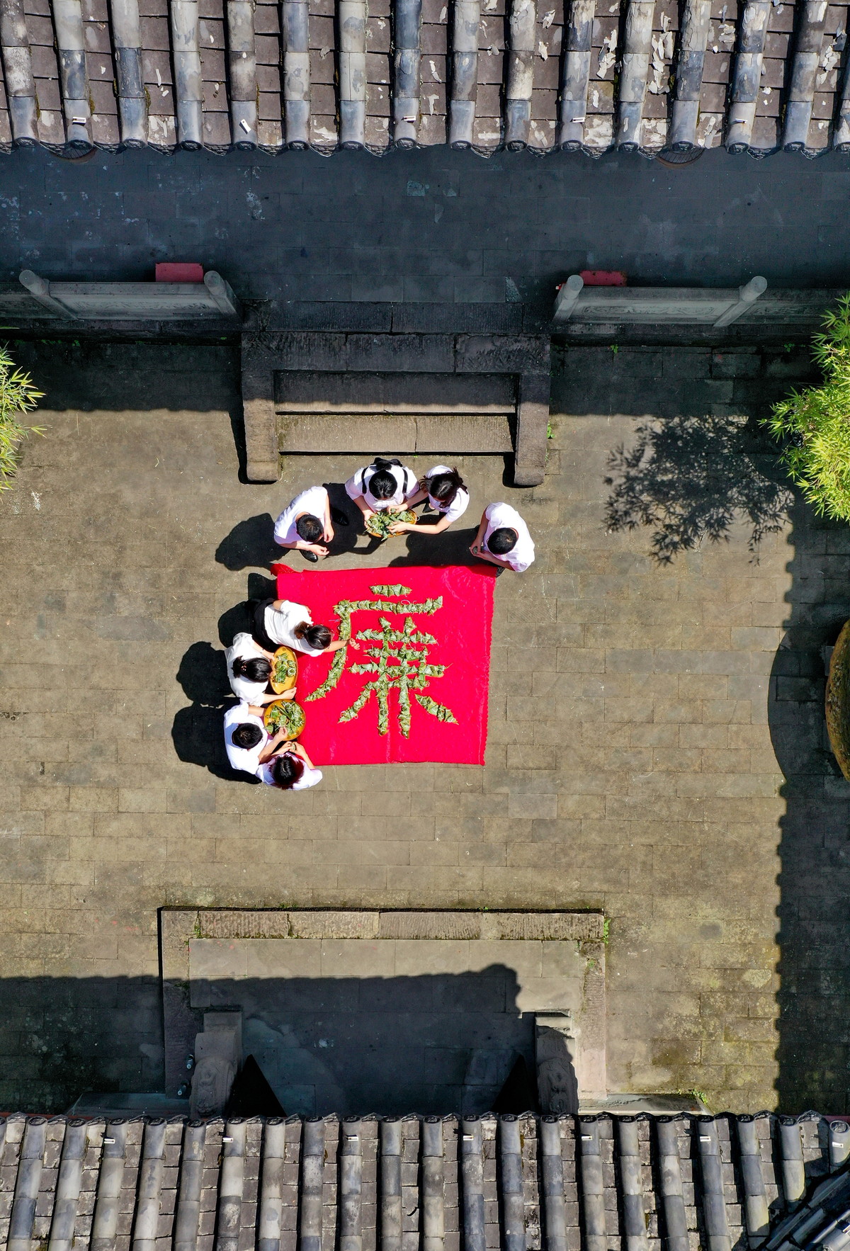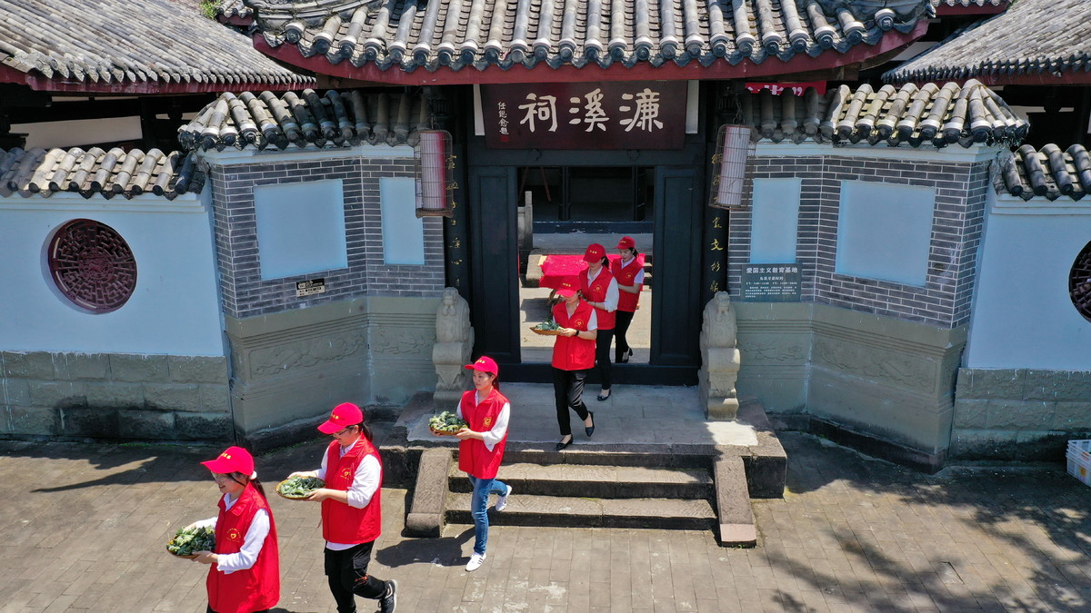 6月5日,在位于四川省南充市蓬安县周口街道下河街社区的“濂溪祠”,蓬安县纪委监委组织的党员干部把包好的粽子组成“廉”字。