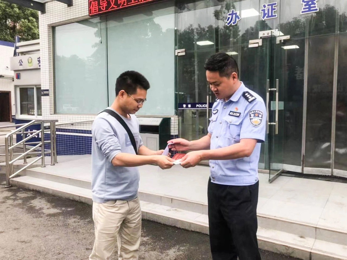经过一个多小时的耐心采集,最终成功完成梁某母亲的身份证信息采集工作。5月25日下午,梁某母亲时隔多年的身份证终于办下来了,在新繁派出所“一站式”服务办证大厅外,梁某从邱廷寿手中接过了母亲的临时身份证,向民警致以谢意。