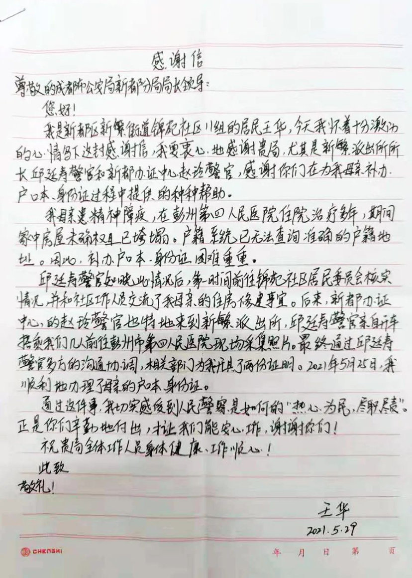 “感谢公安局的好民警帮我母亲办理了身份证,这个事情困扰了我们家至少5、6年了,现在再也不用为母亲的身份证发愁啦,真是太感谢了!”近日,成都市民梁某来到成都市公安局新都分局新繁派出所,向民警衷心感谢。