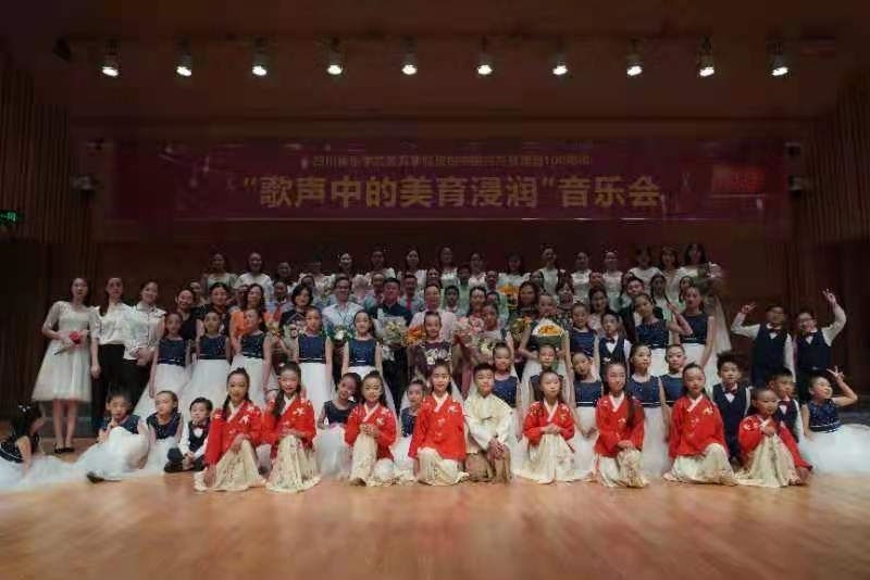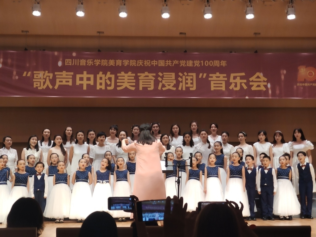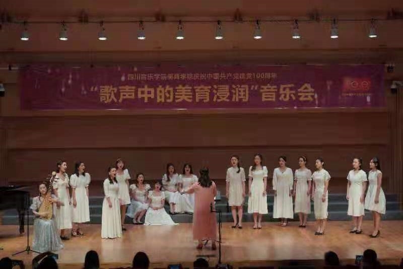 当天晚上,由四川省音乐艺术普及基地、四川音乐学院美育学院主办,四川音乐学院研究生处、四川音乐学院美育中心、四川音乐学院音乐研究所、成都雅师教育咨询有限责任公司协办的“歌声中的美育浸润”音乐会,在成都城市音乐厅上演,200多位来自四川各地中小学、高校的同学为观众献上了10多首合唱歌曲,以庆祝中国共产党建党100周年。