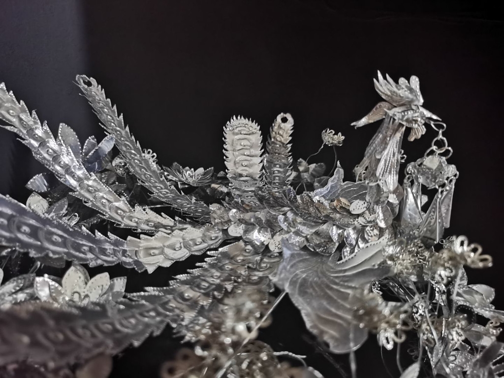 “三百个流苏吊坠,需要刻上一万五千个点阵;一只小小的凤凰,为了达到羽毛丰满的效果,缝制时间累计可以达到七个小时。”谈起团队用铝片制作仿银头冠和项链,《凤凰行歌》团队成员刘雪莲坦言,从搭建骨架、画模到零件加工、零件组装,每一步都需要极大的细心和耐心。为了完成这件作品,团队足足用了3个多月。而之所以选择制作苗族头饰,正是希望通过指间作品,带更多人领略苗寨风光,讲出中国传统文化的独特底蕴,讲出工匠艺人的傲气和匠气。