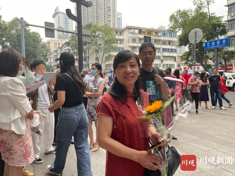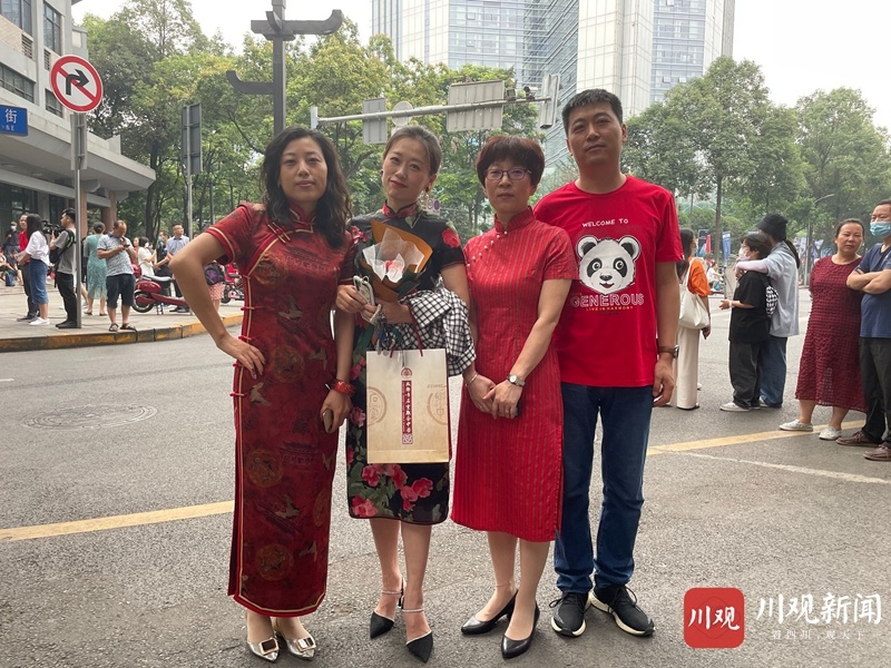 旗袍是家长们的“标准战袍”,徐女士也不例外,她是石室中学考生的家长,今天她身穿红色旗袍,寓意“旗开得胜”,除此之外手上还拿了一支向日葵,寓意“一举夺魁”,徐女士告诉记者,自己的儿子非常佛系,“他没有什么目标院校,考到哪儿就读哪儿。”