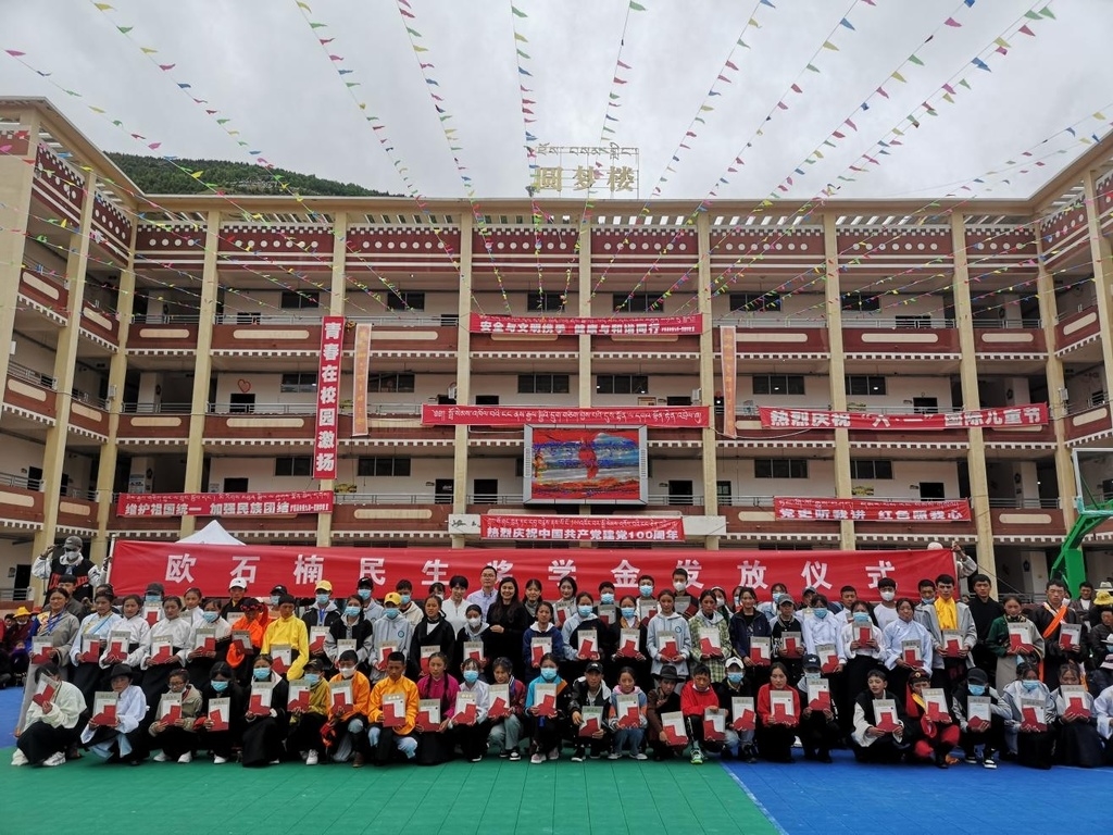 2021年6月1日,在炉霍县典古小学开展欧石楠民生奖学金发放仪式。