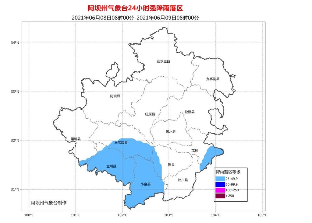 预计,8日08时到9日8时,受高原低值系统影响,阿坝州大部多云间阴天有小雨到中雨,部分地方大雨,其中茂县、金川县、小金县、马尔康市等4县(市)部分地方有暴雨(雨量25~35毫米),过程来临时将伴有短时强降水、雷电和阵性大风等强对流天气。