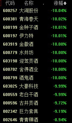 川酒中,水井坊、舍得酒业跌停,泸州老窖大跌7.49%,五粮液跌幅也达到4.78%。
