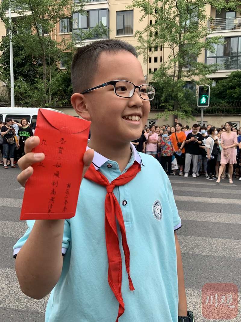 四川在线记者在四川师大附中考点看到,一位小学生手中拿着红包,上面写着“九八五 恭贺二姐顺利高考结束!”,落款为“亲爱的弟弟”。记者了解到,这个红包是由这位小学生妈妈即考生姨妈为考生准备的小礼物,本来准备送1000元,但该考生表弟建议就送985元,“希望姐姐考上985一样的好学校!”