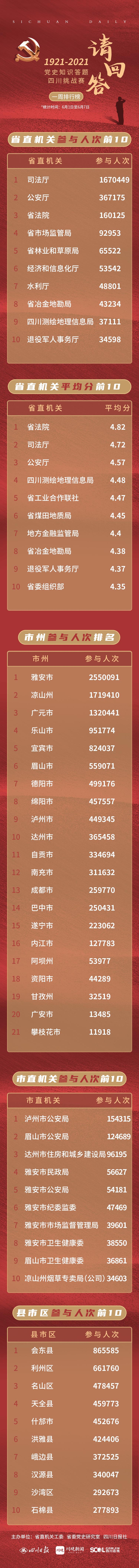 党史知识答题四川挑战赛已持续两月,根据最新数据显示,省直机关参与人次排名前3位的分别是省司法厅、省公安厅、省法院。在平均分排行榜上,省法院、省司法厅、省公安厅分列前三位。