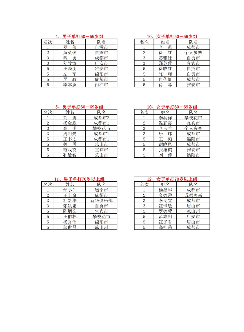 女子单打比赛中,姜雯获得25岁以下组冠军,王婉宁获得25-39岁组冠军,郭清惠获得40-49岁组冠军,李燕获得50-59岁组冠军,李润祥获得60-69岁组冠军,杨墨华获得70岁以上组冠军。除男子单打和女子单打25岁以下组以外,其余冠军选手获得了代表四川参加全运会群众组南区预选赛的资格。