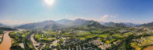 远处群山矗立,近处青绿成片大棚林立,铺就现代农业示范基地推进乡村振兴的生动画卷,迸发出乡村的独特活力。