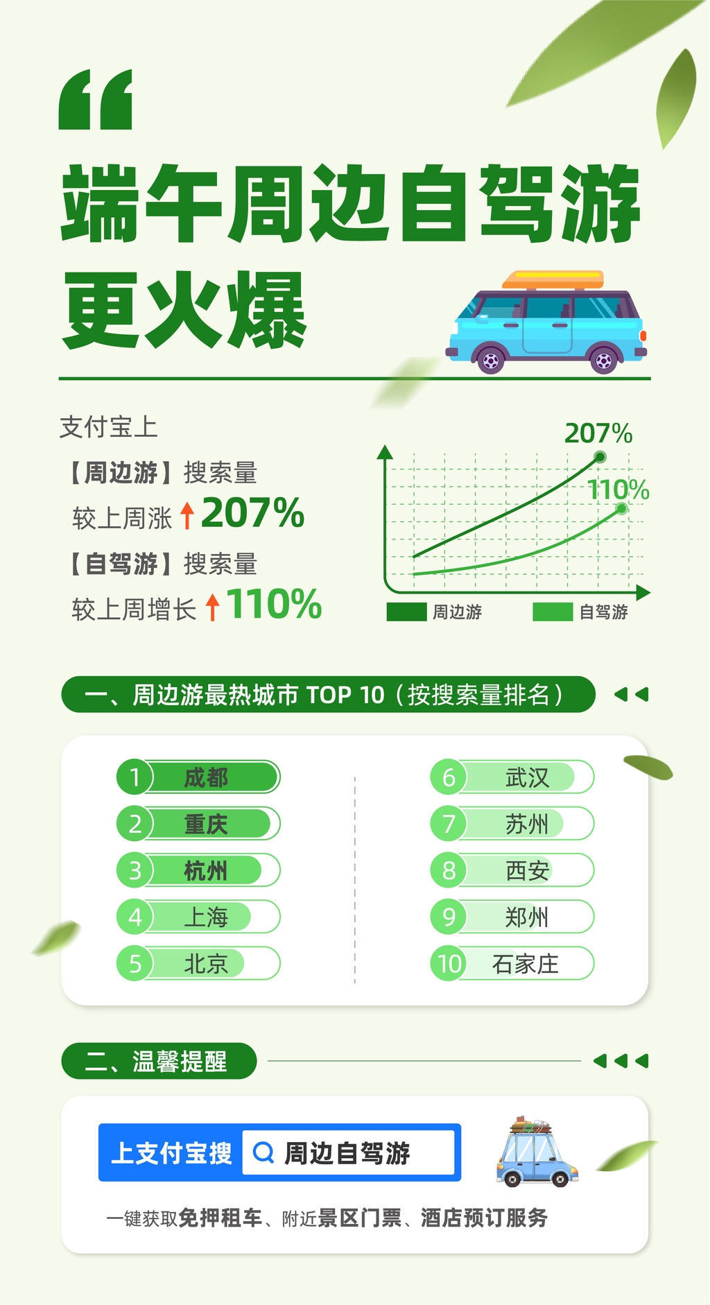 端午节从6月12日至14日,共放3天,无调休。由于假期较短,周边游更受青睐,支付宝上“周边游”搜索量相比上周已增长207%,其中“自驾游”的搜索量也随之上涨110%。