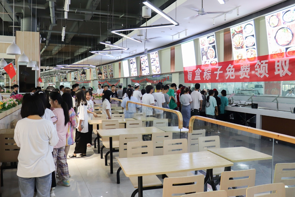 上午9:00,活动正式开始。捋粽叶、放糯米、装馅料、扎麻绳……学生们在食堂阿姨们的指导下,一个个三角粽就包好了,包好后的粽子被统一送到食堂蒸煮。下午16:00,蒸煮好的粽子被放在特定的“盲盒粽子”领取窗口,供师生们免费领取食用。