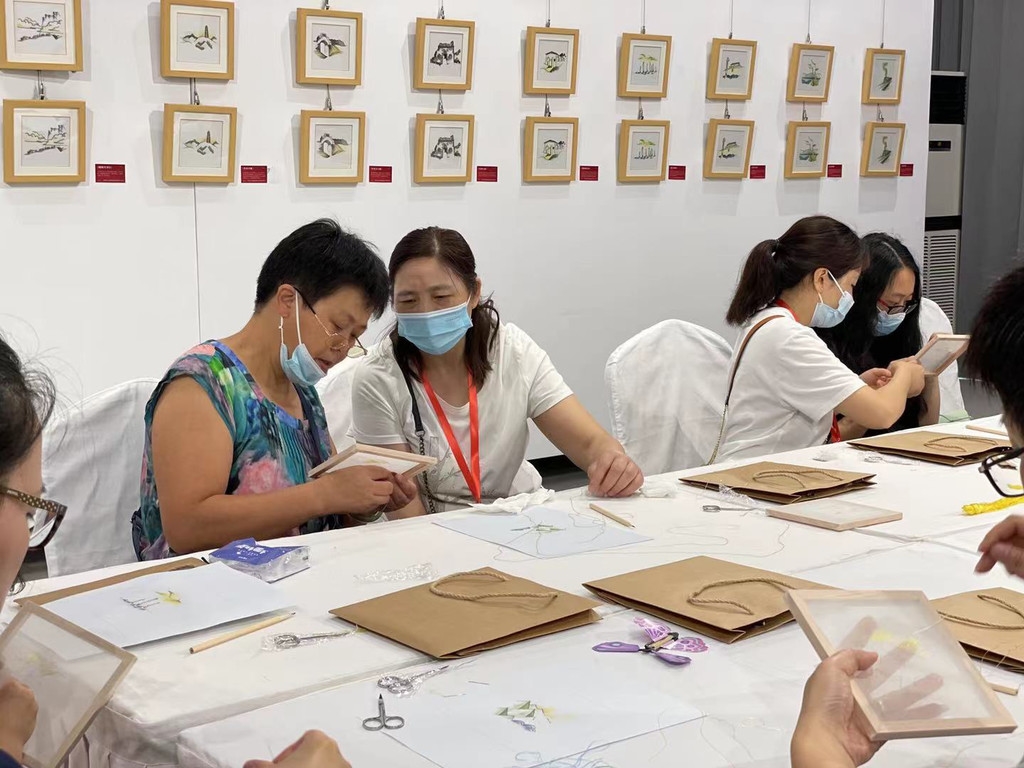 在活动现场,一个个参观者满怀好奇地加入到蜀绣体验的队伍中,小小绣花针在指尖翻转,五彩的丝线穿梭于锦缎之上,有的动作优雅轻巧,有的迟钝可爱,让人目不暇接,一幅幅五花八门的绣作也呼之欲出。