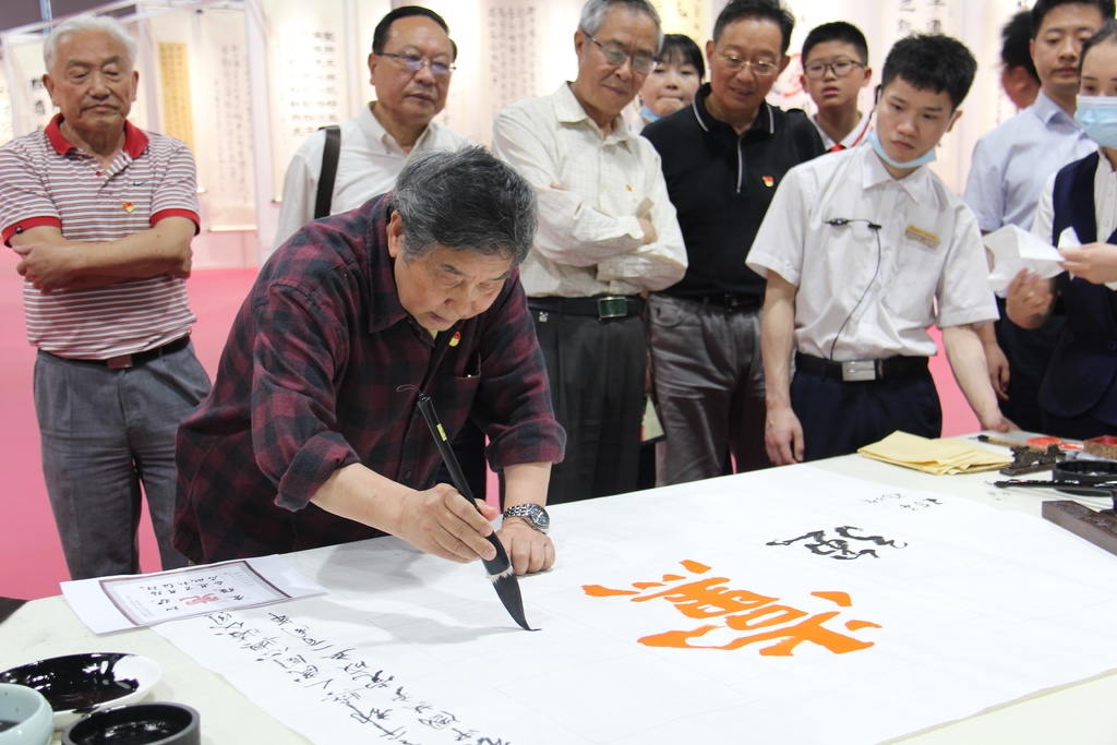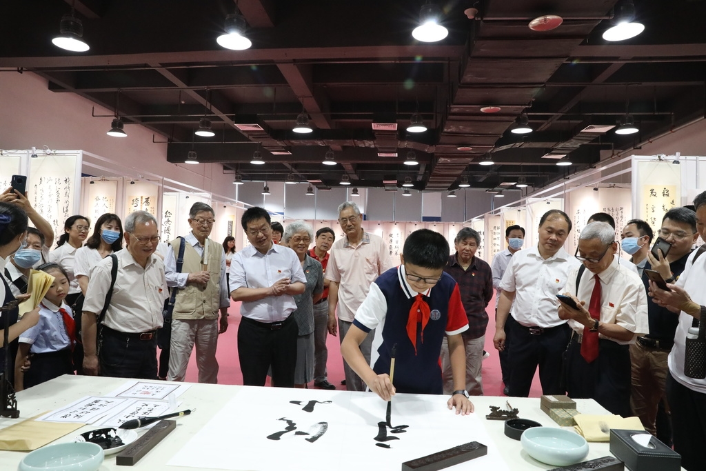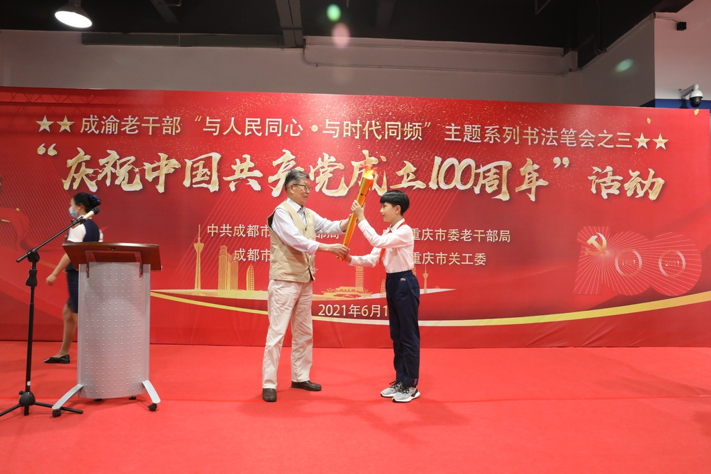 笔会现场,六位老干部共同创作了一幅以“党”字为主题的作品,表达了他们“奋进百年路、起航新征程”的美好祝愿。由老干部和青少年代表合写的“从小学党史、永远跟党走”“学习新思想、做好接班人”两幅作品,与现场举行的火炬交接仪式相得益彰,共同寓意红色基因永不褪变、革命薪火代代相传。