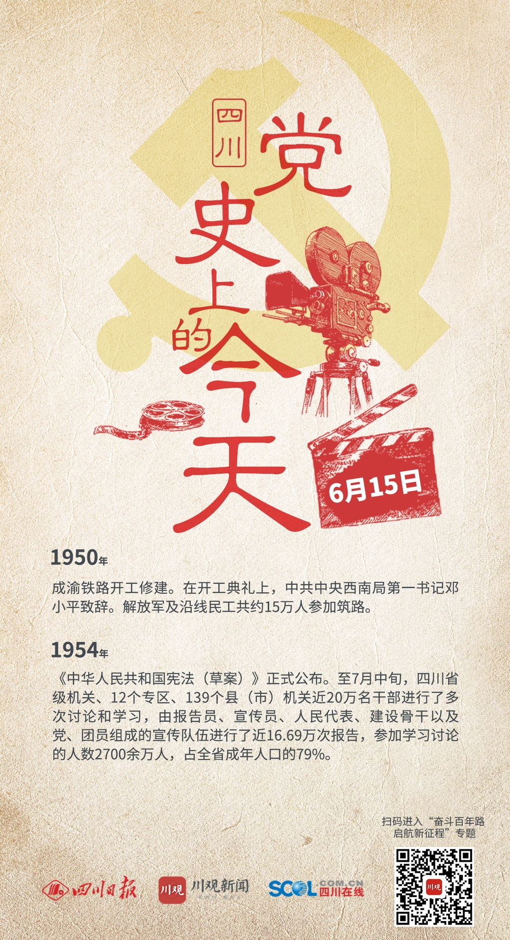 1954年 《中华人民共和国宪法(草案)》正式公布。至7月中旬,四川省级机关、12个专区、139个县(市)机关近20万名干部进行了多次讨论和学习,由报告员、宣传员、人民代表、建设骨干以及党、团员组成的宣传队伍进行了近16.69万次报告,参加学习讨论的人数2700余万人,占全省成年人口的79%。