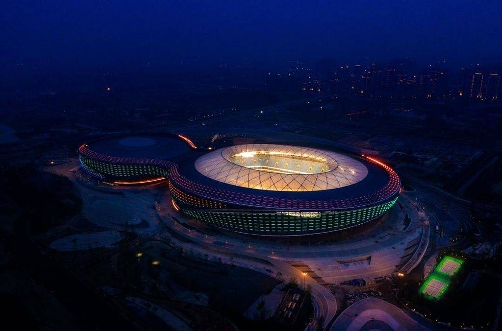 从空中看,有人说凤凰山体育公园的造型像“盖碗茶”——碗在右盖在左,碗大盖小,碗是能容纳6万人的足球场,盖是可坐1.8万人的一大一小两场馆。也有人说它像一个异形的无穷大符号,足球场大、两场馆略小,从空中看像躺着的“8”字……