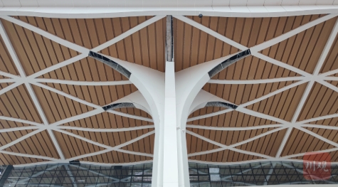 自贡高铁站则从盐晶体中汲取灵感,用菱形格构拼接成六边形盐晶体纹样,用彩釉抽象出白色盐晶从中间向两侧渐变,由虚到实抽象表达盐结晶的动态过程。为突出自贡恐龙之乡的地域文化,工程设计时巧妙融入相关元素,使得站房正立面下沿微微起拱,远看仿佛一头恐龙优雅的脊背曲线。到了夜晚,结合灯光设计整个高铁站房犹如一个巨大彩灯照亮旅客回家的路。