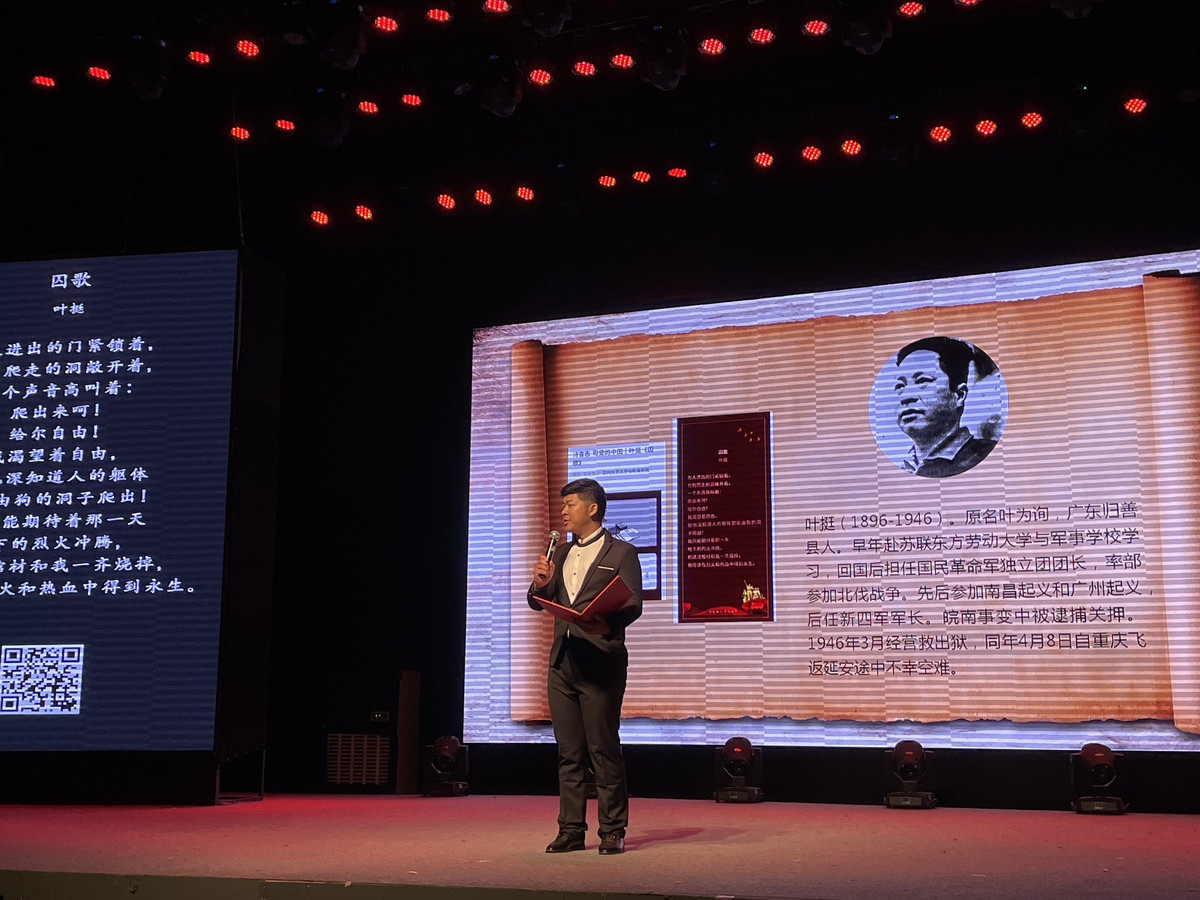 此次诗歌朗诵活动,从众多的红色诗篇中,精选出《五月之夜呵》《我的家》《我的“自白书”》《囚歌》《生活》《山中即景》《给“论持久战”的著者》《毛泽东》《莫斯科吟》《可爱的中国》等十首热血壮歌,在该院师生极富感染力的朗诵中,带领观众重回革命年代,致敬中国共产党领导中国革命的光荣岁月。