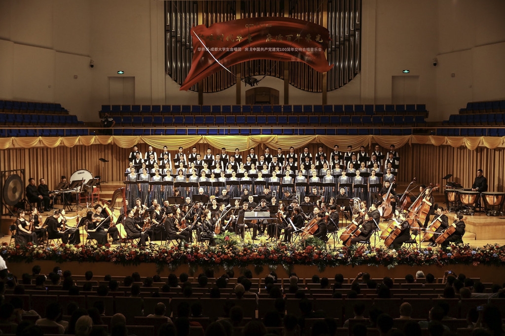 6月19日,“歌咏时代华章 赓续百年荣光”交响合唱音乐会在成都城市音乐厅上演,“华侨城—成都大学生合唱团”用气势滂沱的歌声表达了对祖国母亲的款款深情,为建党100周年献礼。《妈妈教我唱支歌》、《永远跟党走》、《人民解放军占领南京》、《忆秦娥.娄山关》等16首耳熟能详的经典歌曲,为成都市民带来了一场视觉、听觉的饕餮盛宴。