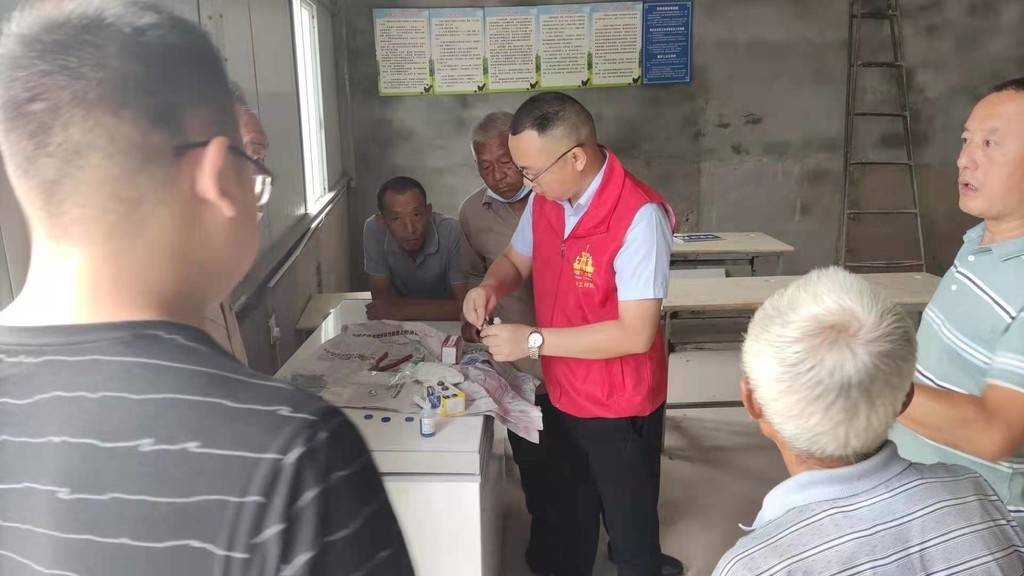 科技特派员唐利军正在教养殖户打疫苗