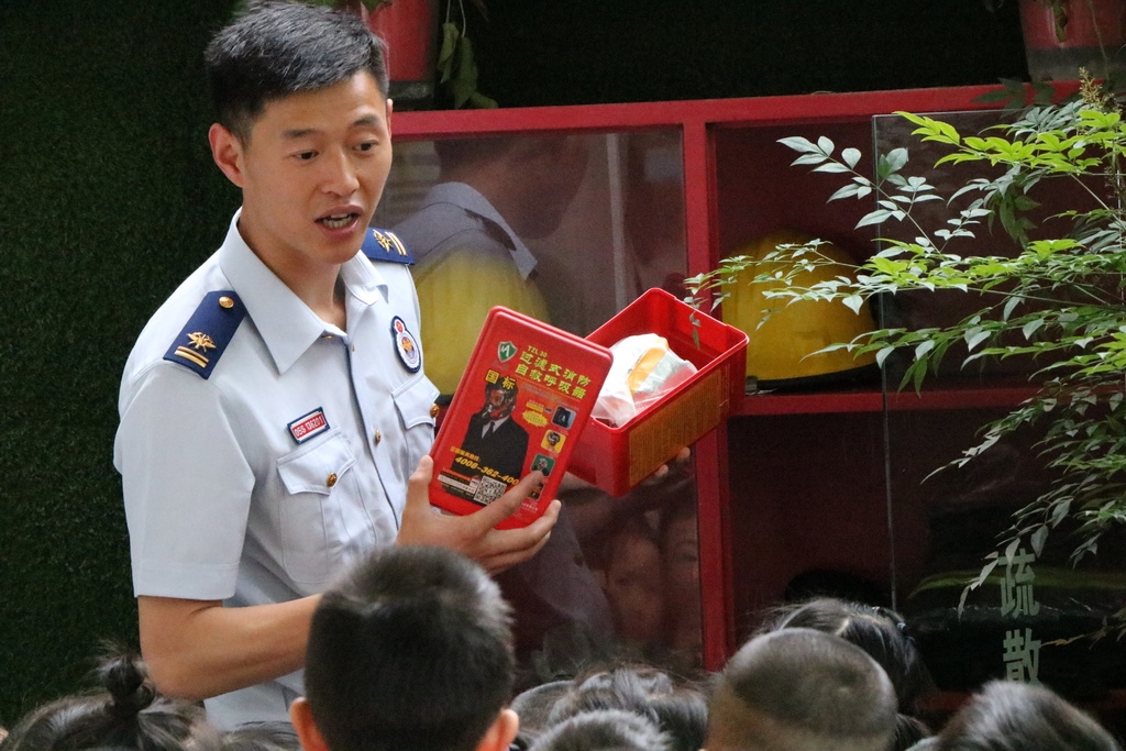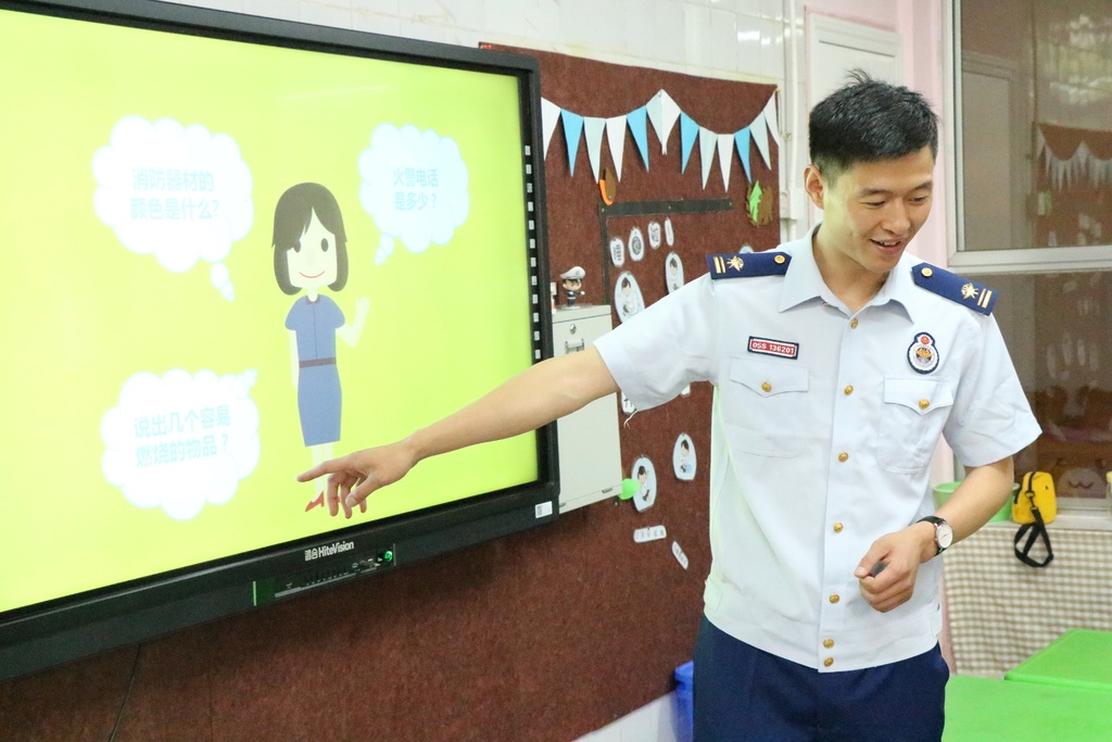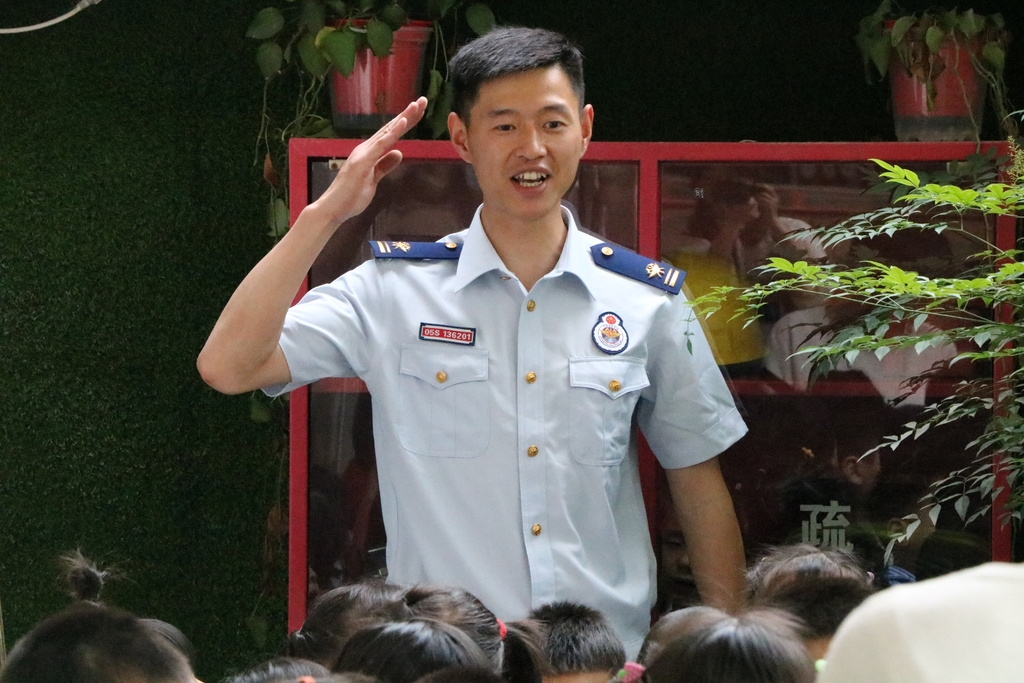 “小朋友们,你们知道火警电话有几个吗?”“有一个,119。不对,有两个,我爸爸告诉我还有一个12119,那是发生森林火灾时需要打的电话”“那发生火灾时应该怎么办?要怎么逃生呢?”“不知道呀!”“好,下面叔叔来告诉小朋友们……用湿毛巾捂住口鼻……,弯下腰……”课堂上,叶阳和小朋友们展开了互动,耐心细致的对全体师生进行了消防安全知识教育和遇到火灾时逃生自救的方法等。