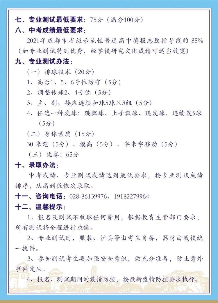 排球小将看过来!为打造成都体教融合名片,加强体育后备人才培养。经成都市教育局、体育局批准,按照《关于做好高中女子排球高水平运动员预备队招生及培养有关工作的通知》要求,成都石室中学将面向全市招收高中女子排球高水平运动员预备队。具体有哪些要求呢?