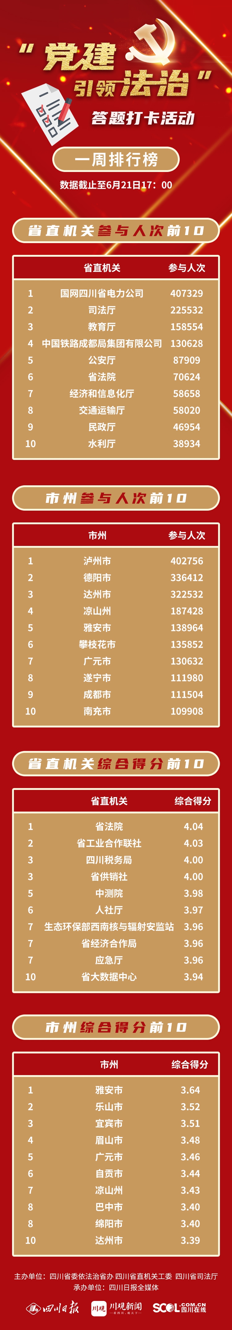 截至6月21日的数据显示,“党建引领法治”答题打卡活动已覆盖全省122个省直机关,21个市州、1344个市(州)直机关,参与答题3675399人次,阅读点击量12873866人次。