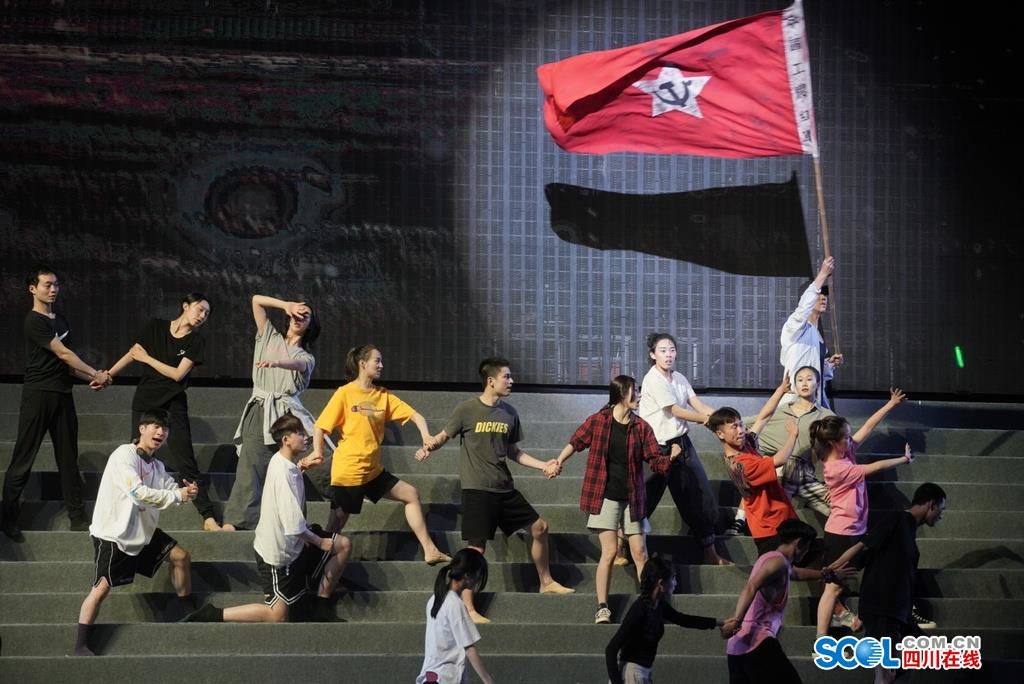 “大与小,虚与实,多与少。”潘勇总结,他正是用这三对关系,把握着整场演出的叙事走向,处理着这场演出的观赏性、艺术性和政治性的关系。具体来看,在处理“大与小”的关系时,面对较为宏大严肃的国家层面的题材,首先要在大方向上,准确把握国家层面的党史故事。同时,也要在此基础上“聚焦四川”这个“小”角度。大与小的互动中,开启国家篇章里的四川党史故事。