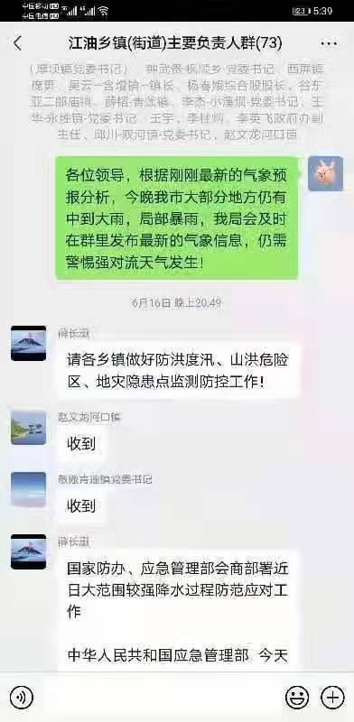 落实专人专岗联络市防汛抗旱指挥部,主动叫应“气象研判会商”微信群中的市应急管理局、市自然资源和规划局、市水利局、市水文局等单位,滚动发布天气实况、雨量现报及后期天气形势分析……强降雨过程期间,绵阳市气象局一系列操作,为各单位及时作出相应的防御部署提供了有效保障。绵阳市市长元方评价:“在‘6.16’区域性暴雨天气过程中,市气象局主动作为、靠前服务,为此次安全度汛发挥了重要作用”。