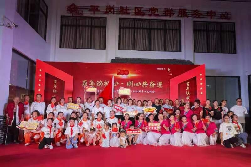 为庆祝中国共产党成立100周年,进一步继承和发扬党的优良传统,充分发挥基层战斗堡垒和党员先锋模范作用,新津区五津街道平岗社区的干部群众积极参与,一起筹划并演出了这台晚会。当天,舞蹈《党啊,我亲爱的母亲》拉开了演出序幕;《我的梦中国梦》《天耀中华》《中国脊梁》等弘扬主旋律的作品弘扬了党100年来历经沧桑、历经锤炼和洗礼、始终坚定不移的伟岸形象;社区合唱团演唱歌曲《我的祖国》,用情感饱满的歌声为辖区居民带来一场盛宴。活动最后,大家一起合影留念,共同祝愿祖国繁荣昌盛。