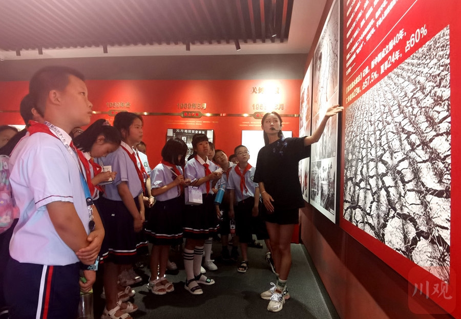 6月23日,在仁寿县黑龙滩水库陈列馆,学生们正在聆听黑龙滩水库精神。