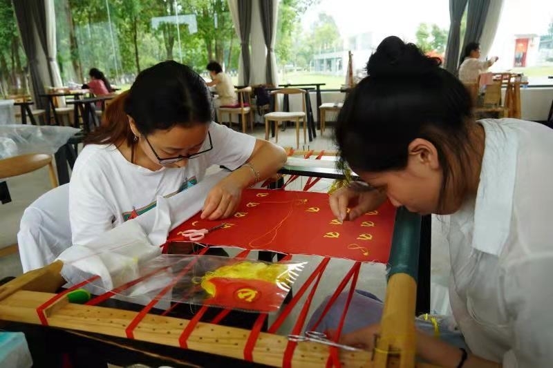 “为庆祝中国共产党成立100周年,通过运用非物质文化遗产蜀绣,对党的历史发展进行回顾,通过非遗文化弘扬爱国情怀,展现党的光辉历程,安靖街道开展‘蜀绣秀百年’主题展。”据安靖街道相关负责人介绍,多年来,安靖街道着力打造蜀绣发展载体,强化蜀绣人才培养、产品研发设计、营销平台建设及品牌保护等工作,2021年,蜀绣文化创意公园被评为四川非物质文化遗产传习基地。