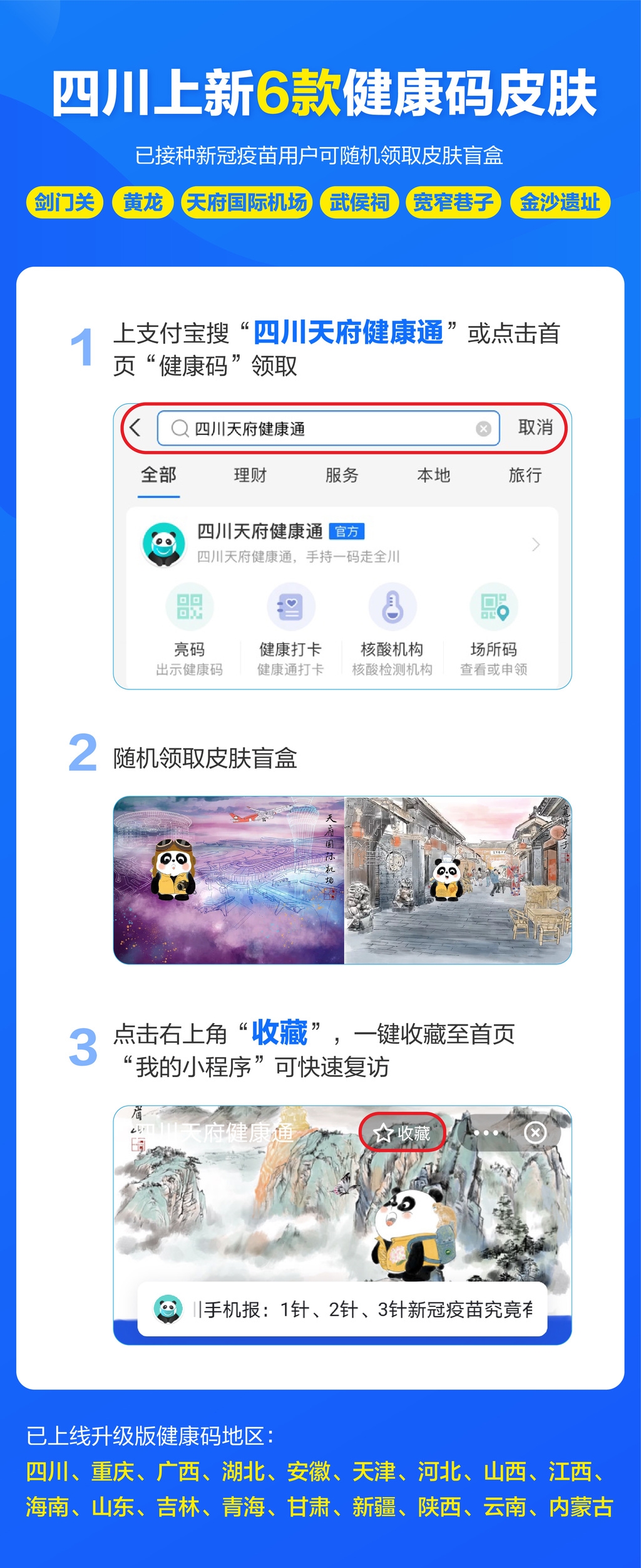 6月24日,记者从支付宝获悉,“四川天府健康通”再次实现升级,上线了6款新的健康码皮肤。此前,四川健康码已上线杜甫草堂、峨眉山、九寨沟、乐山大佛、青城山和三星堆等背景,此次又增添了剑门关、黄龙、天府国际机场、武侯祠、宽窄巷子和金沙遗址等6款背景。凡在四川省完成新冠疫苗接种的用户可上支付宝领取盲盒,12款背景随机产生,且人手一只熊猫图标。