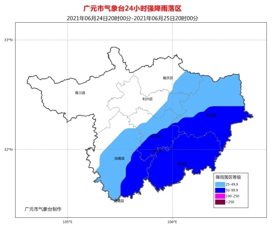 广元市气象台6月24日下午发布暴雨蓝色预警:受高空槽和暖湿气流影响,24日20时到25日20时我市普遍有中到大雨(10至40毫米),其中苍溪县、旺苍县南部、昭化区南部、剑阁县东部有暴雨(50至70毫米),个别乡镇雨量可达100毫米以上,降雨时伴有雷电、阵性大风等对流天气,请注意防范。