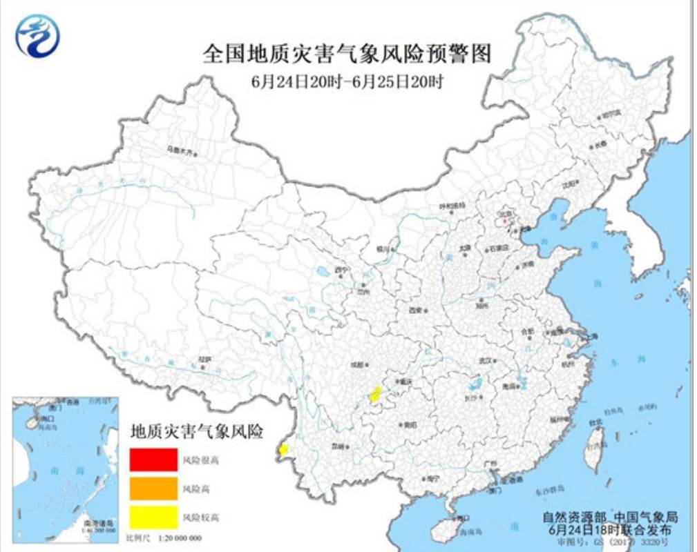 据中国天气网报道,自然资源部与中国气象局6月24日18时联合发布地质灾害气象风险预警:预计6月24日20时至6月25日20时,云南西部和四川东南部等地发生地质灾害的气象风险较高(黄色预警)。请当地居民注意防范降水引发的地质灾害,尤其是地质灾害隐患点附近区域。